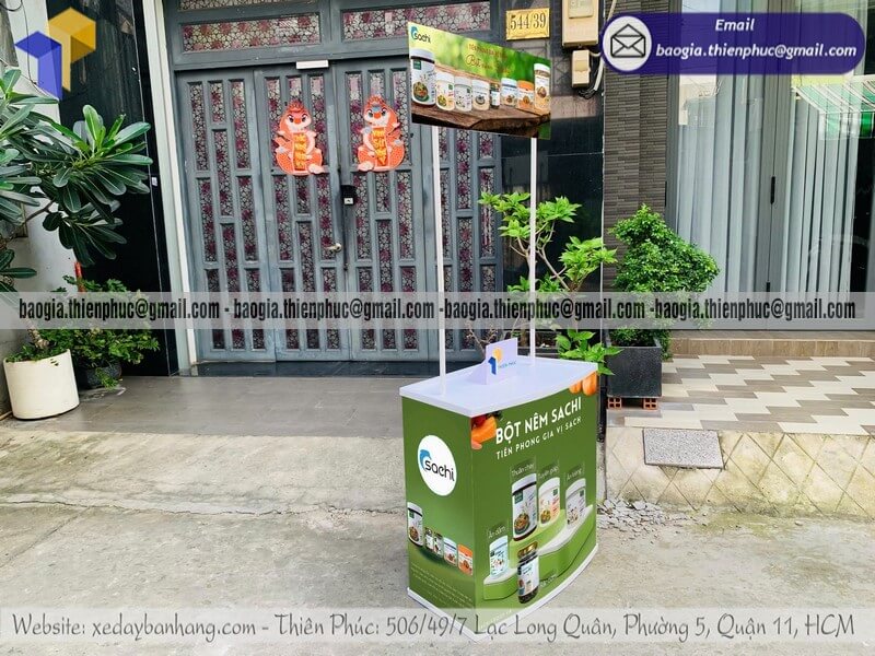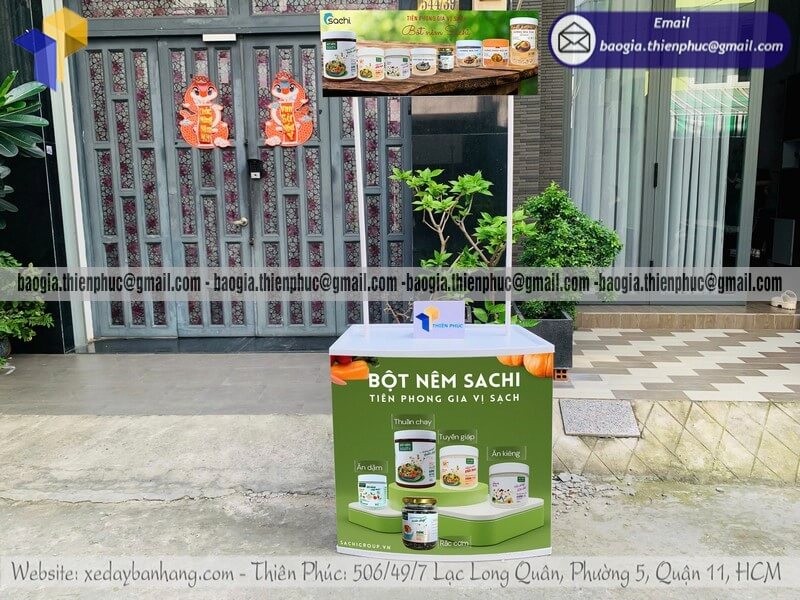 Mẫu booth sampling quảng cáo in thương hiệu đẹp có bánh xe di chuyển
