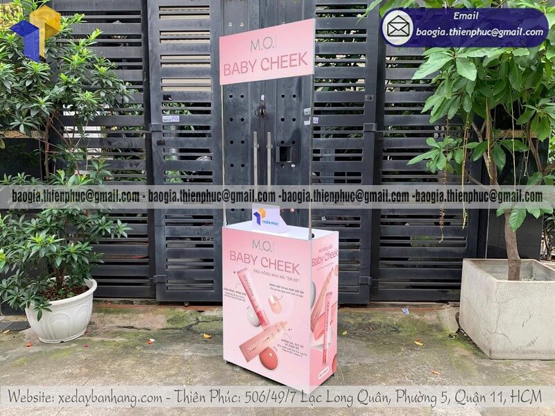 Mẫu quầy sampling quảng cáo in thương hiệu đẹp có bánh xe di chuyển