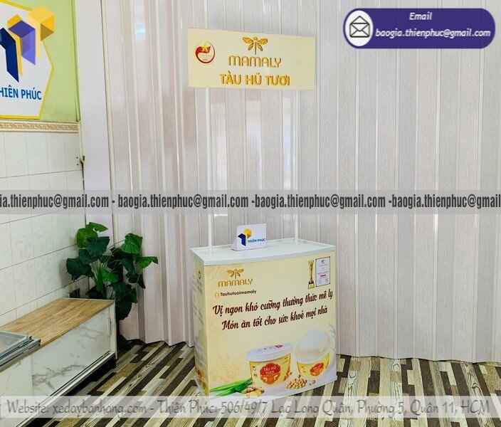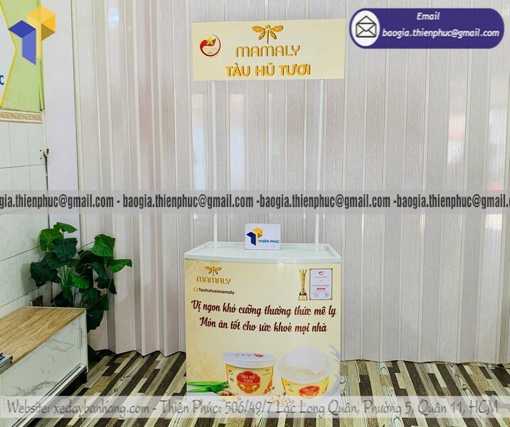 Mẫu booth sampling quảng cáo in thương hiệu đẹp có bánh xe di chuyển