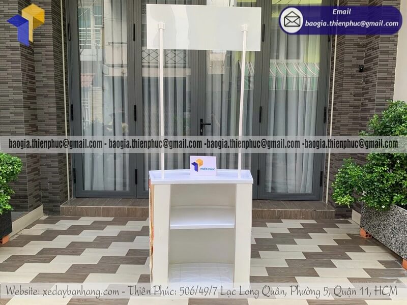Giá dao động từ khoảng trên 800.000đ/cái – 900.000đ/cái trở lên cho mẫu cơ bản. Các mẫu có kệ nhiều tầng, backdrop, mái che hoặc thiết kế riêng sẽ có giá cao hơn tùy kích thước và vật liệu.