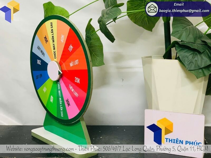 Đặt làm vòng xoay gỗ trúng thưởng để bàn khuyến mãi - Xưởng sản xuất & Công Ty Thiên Phúc chuyên nhận sản xuất và cung cấp mẫu vòng xoay bằng gỗ trúng thưởng để bàn với đường kính 30cm, 40cm với thiết kế logo hoàn toàn miễn phí, thiết kế các ô quà tặng giải thưởng theo yêu cầu khách hàng. Hỗ trợ xuất hóa đơn đỏ VAT doanh nghiệp, công ty. Đơn hàng từ 10 cái trở lên được chiết khấu cực kỳ ưu đãi. Dao động với giá cạnh tranh nhất thị trường chỉ từ 400.000đ/cái - 600.000đ/cái trở lên (chưa tính các chi phí phụ đi kèm)