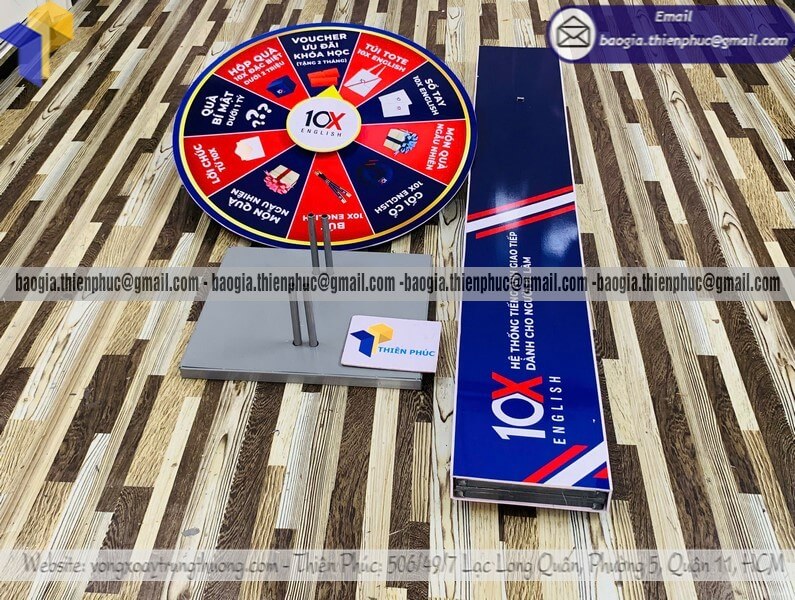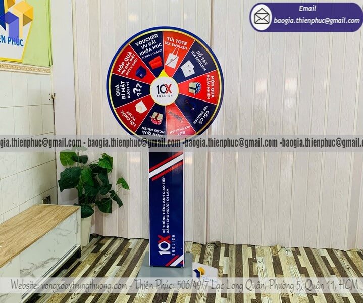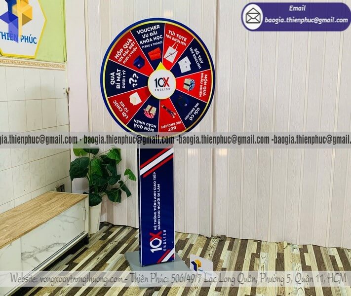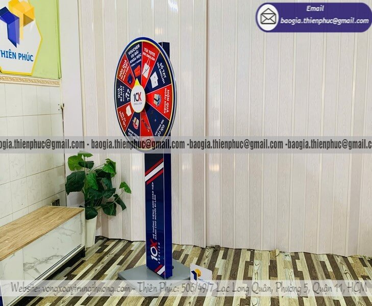 Đặt vòng xoay thưởng lớn random trúng quà marketing - Xưởng sản xuất & Công Ty Thiên Phúc chuyên nhận đặt làm kích thước, mẫu mã theo yêu cầu, sản xuất, gia công, cung cấp nhiều mẫu vòng xoay quảng cáo từ nhỏ đến cỡ lớn trúng thưởng chính hãng. Giá rẻ cạnh tranh nhất thị trường dao động chỉ từ 1.300.000đ/cái - 2.600.000đ/cái đối với mẫu vòng xoay đứng thân trụ/bảng trụ kèm thiết kế logo các ô quà tặng, voucher miễn phí theo yêu cầu khách hàng. Hỗ trợ xuất hóa đơn VAT nhanh chóng. Giao hàng nhanh trên toàn quốc từ 2-3 ngày.