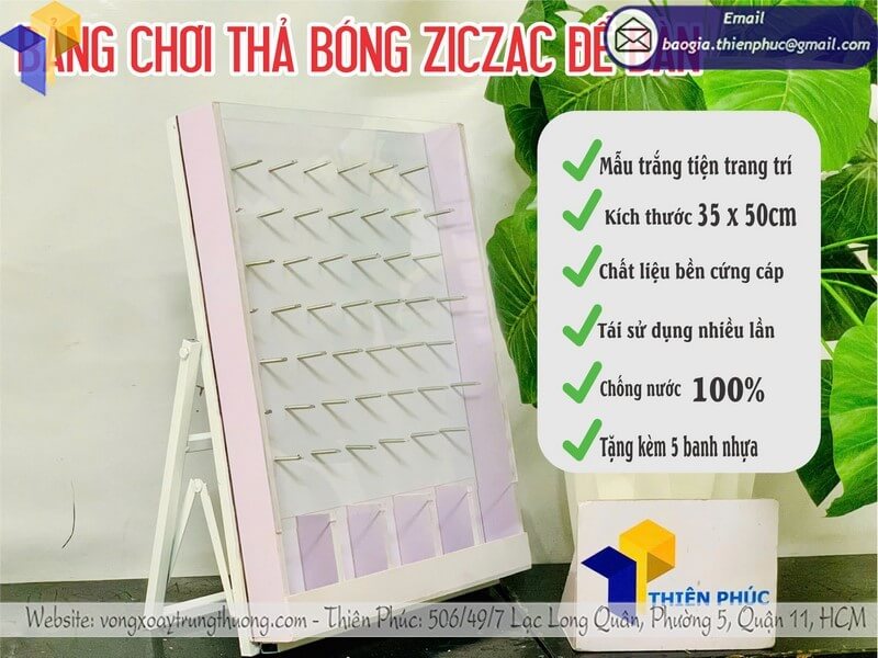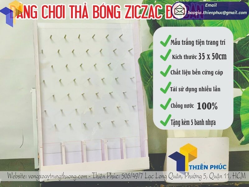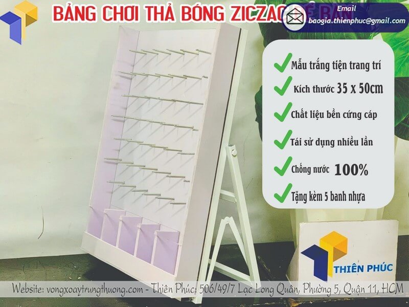 Hộp chơi thả banh rơi ziczac trúng thưởng theo yêu cầu là trò chơi may mắn được thiết kế theo cơ chế banh rơi qua các chốt ziczac và rơi vào các ô phần thưởng khác nhau. Sản phẩm có thể đặt theo yêu cầu, phù hợp với từng loại sự kiện, từng kích thước, màu sắc, thiết kế logo và quà tặng đi kèm.