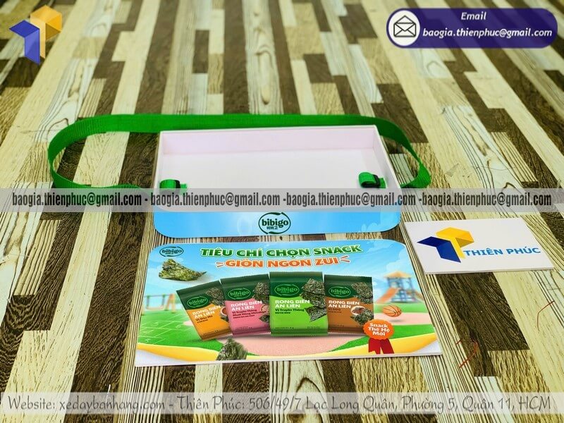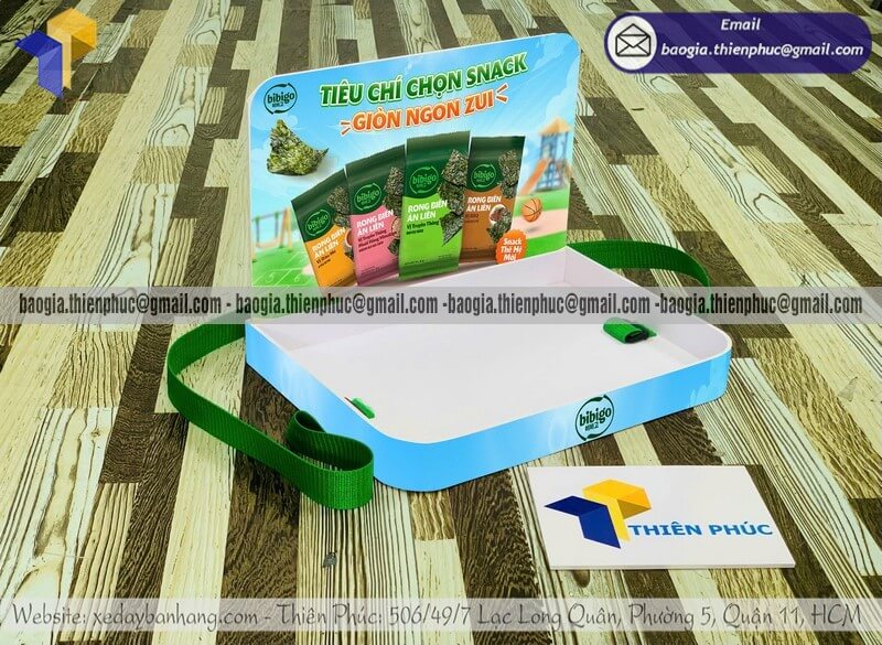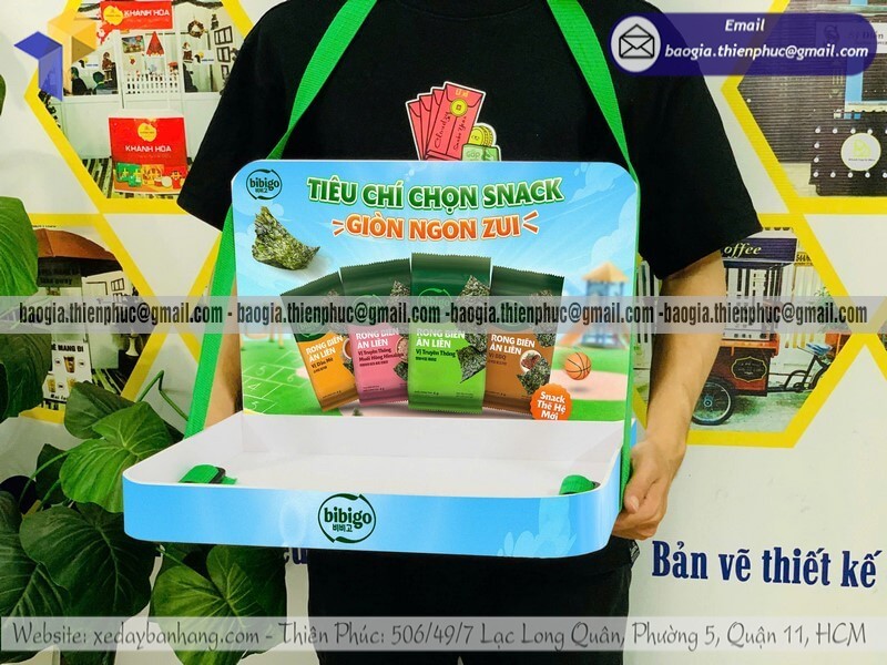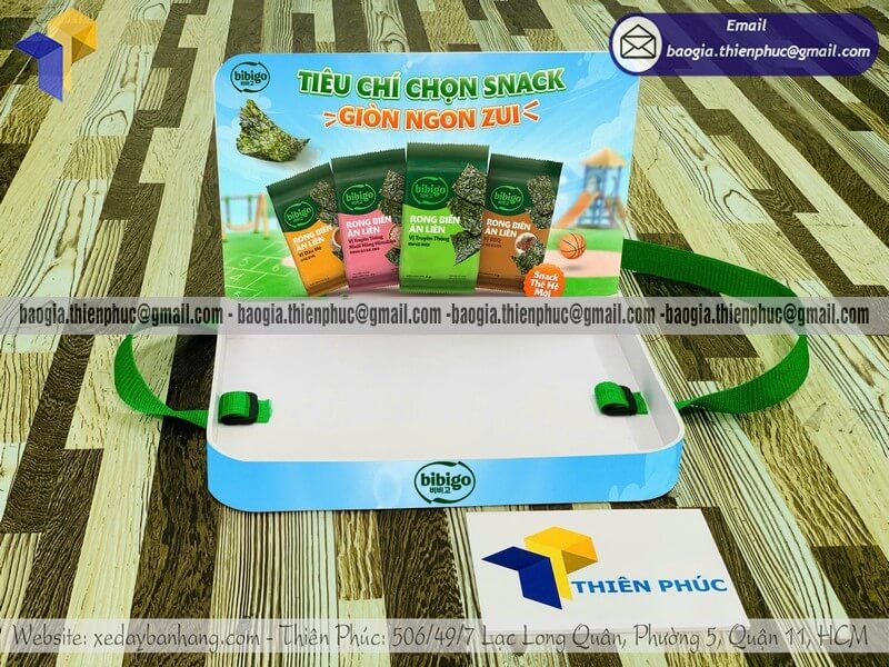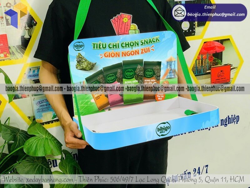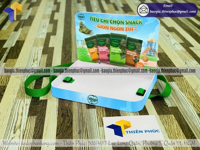 Tên sản phẩm: Khay có dây đeo sampling phát hàng mẫu thử giá rẻ với sản phẩm SNACK RONG BIỂN BIBIGO