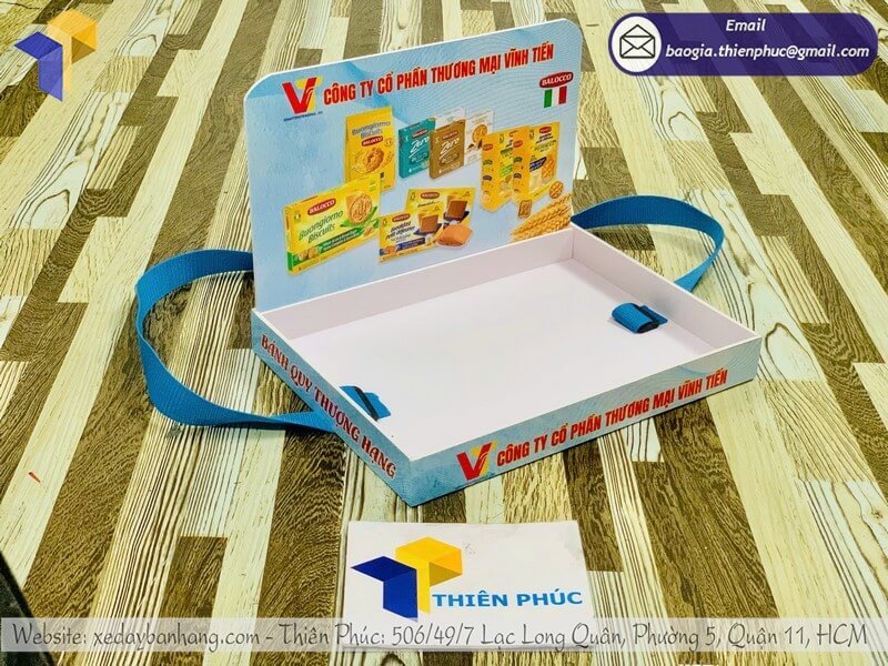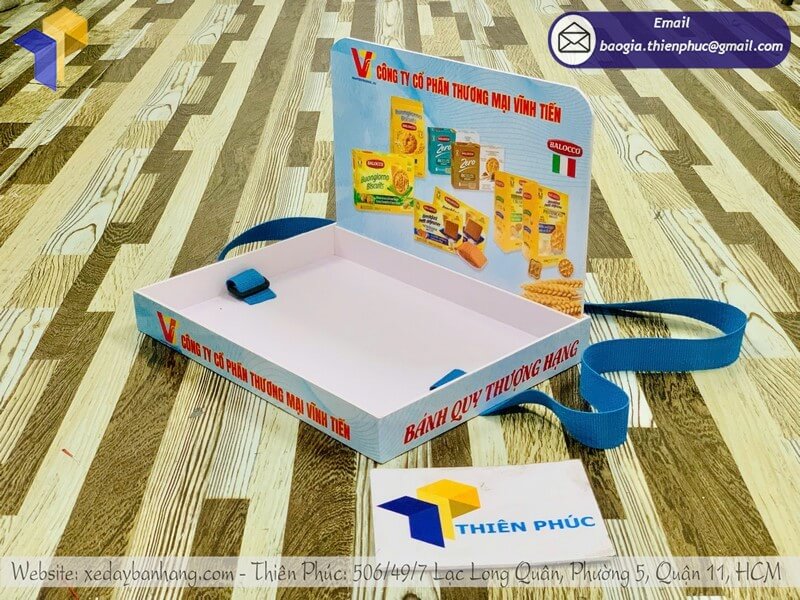 Thiết kế có dây đeo giúp khách hàng dễ dàng mang theo khi đi tham quan triển lãm hoặc di chuyển giữa các gian hàng. Nhờ đó, sản phẩm mẫu luôn trong tầm tay và tăng khả năng tiếp cận khách hàng tiềm năng.