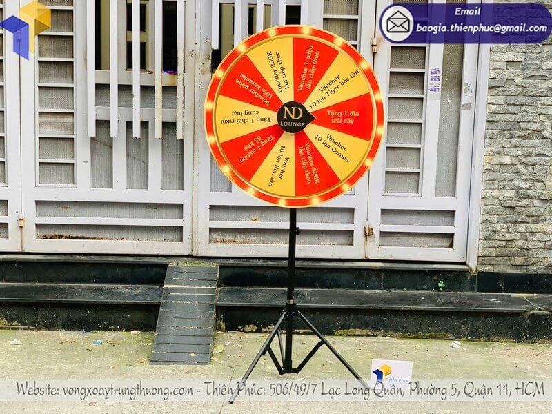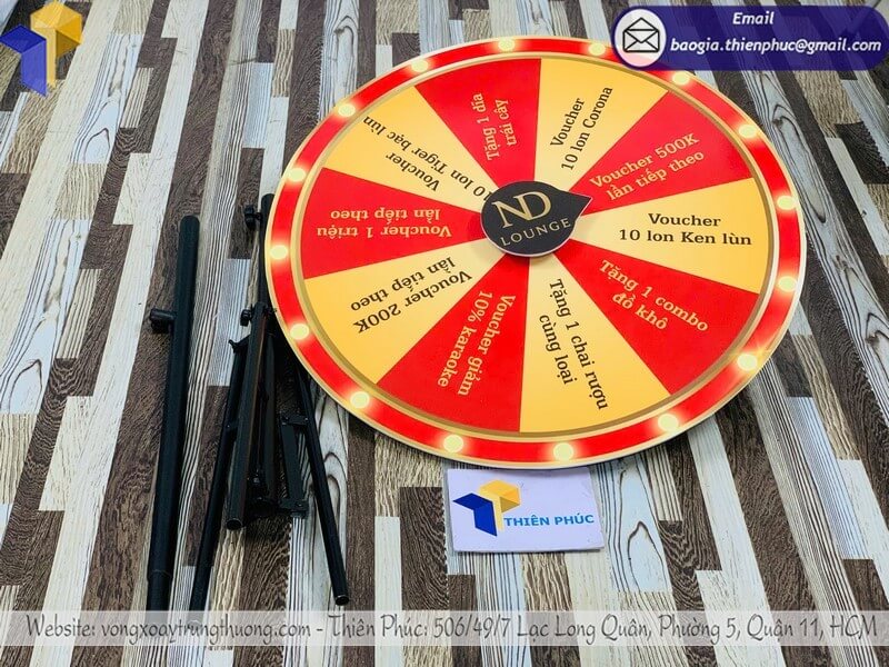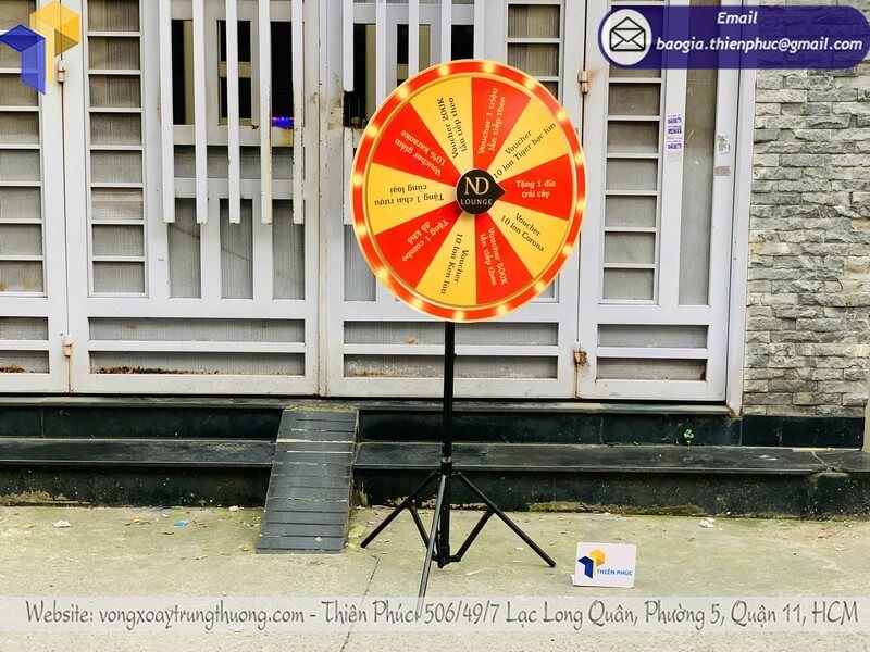 Nơi bán vòng xoay trúng thưởng cỡ lớn cho sự kiện rẻ - Xưởng sản xuất Thiên Phúc là nơi cung cấp - gia công nhiều mẫu vòng xoay trúng thưởng từ cỡ nhỏ để bàn đến cỡ lớn cho sự kiện. Giá dao động chỉ từ 850.000đ/cái trở lên cho mẫu vòng xoay chân xếp đứng. Nhận đặt hàng số lượng lớn, giảm giá sâu cho đơn hàng từ 10 cái trở lên.