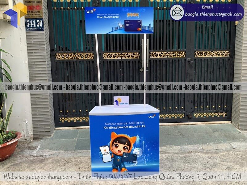 Tại xưởng sản xuất trực tiếp, chúng tôi cung cấp nhiều mẫu Quầy tiếp thị sản phẩm di động ngoài trời với thiết kế linh hoạt, phù hợp cho hoạt động quảng bá, sampling, activation, roadshow và bán hàng lưu động. Mỗi mẫu quầy đều được gia công chắc chắn, in ấn thương hiệu sắc nét và có thể tùy chỉnh theo nhu cầu thực tế của từng doanh nghiệp.