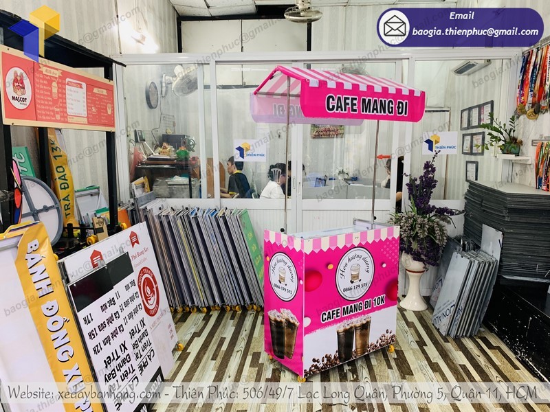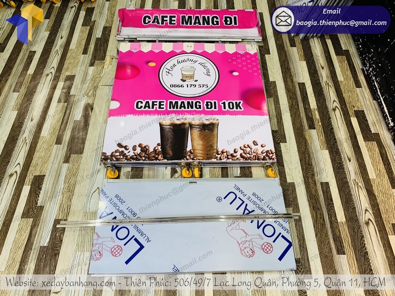 Các loại biển hiệu dành cho các chương trình khuyến mại nên làm thật to và nổi bật đặt cạnh xe bán cà phê lắp ráp để hấp dẫn khách hàng.